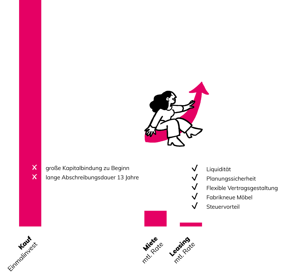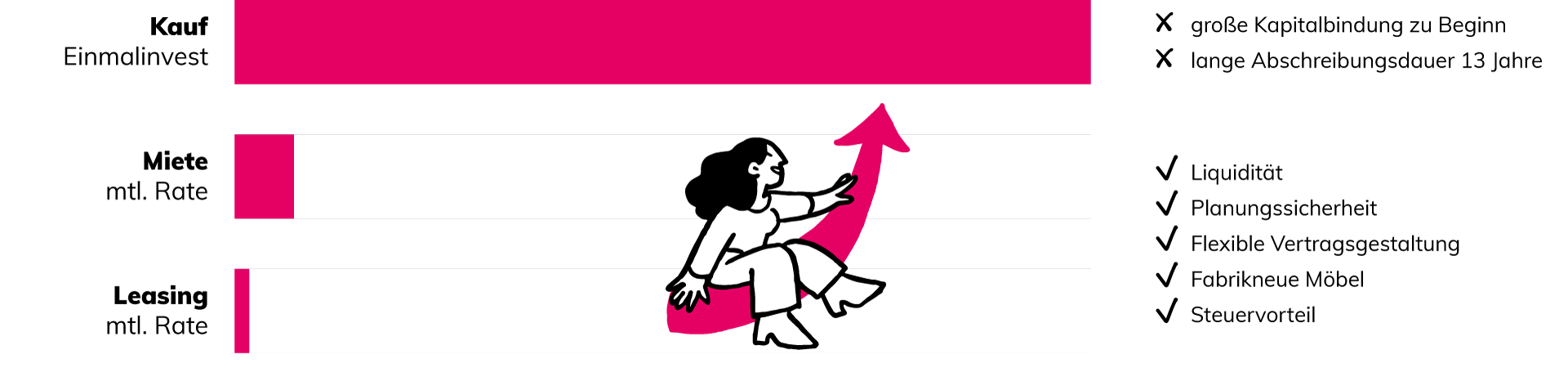 Dabei ist es unerheblich, wie hoch die Rate ist. Selbst Komplettausstattungen mit monatlichen Raten im drei- oder sogar vierstelligen Bereich senken Ihre monatliche Steuerlast und führen zu einer direkten Entlastung. Und am Ende? Entscheiden Sie einfach selbst, ob Sie die Möbel übernehmen wollen oder den Vertrag verlängern und sich neu ausstatten lassen.