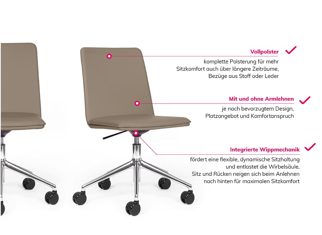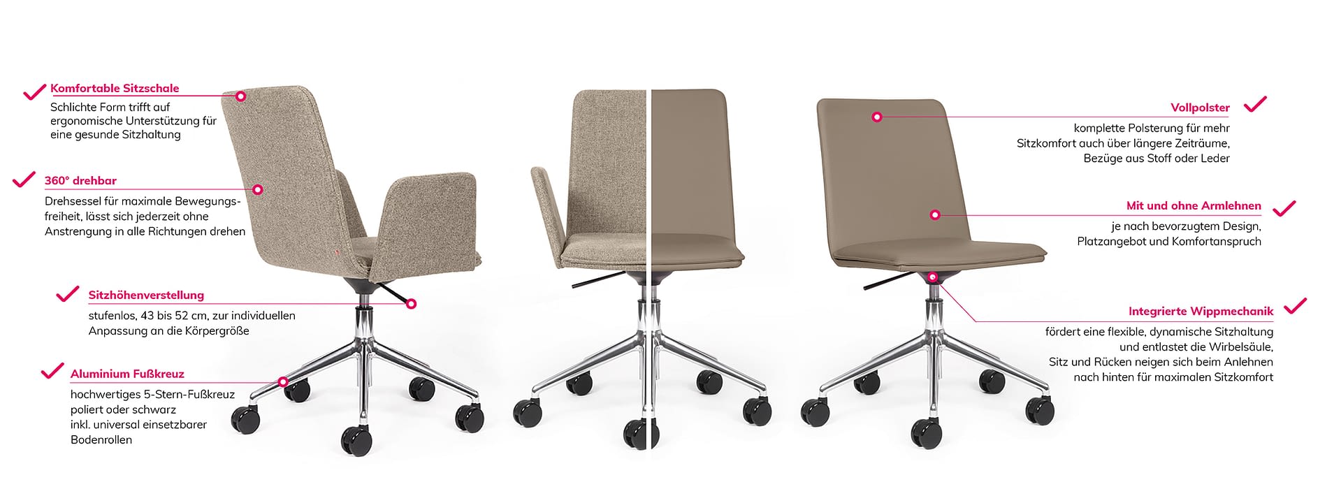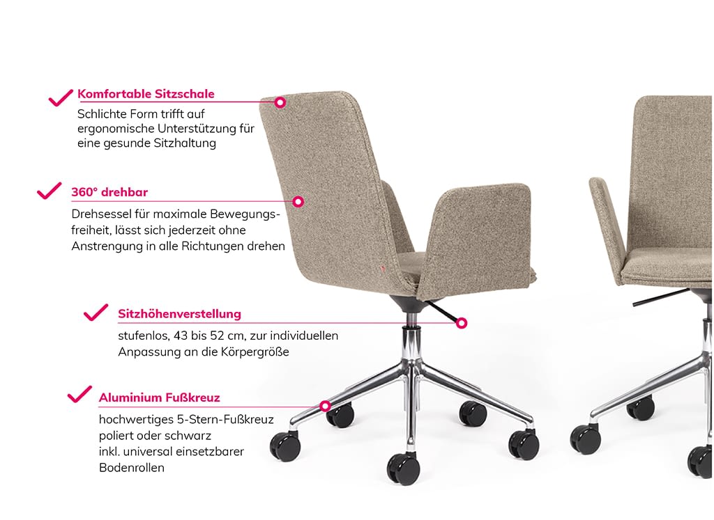 Die Konferenzstühle mit komfortabler Polsterung, einem modern-zeitlosen Design und einer breiten Palette an Bezugsstoffen und Farben sind so wandelbar, dass sie sich garantiert auch Ihrem Einrichtungsstil anpassen. Setzen Sie auf Qualität und Funktionalität Made in Germany mit 10 Jahren Herstellergarantie – für erstklassigen Sitzkomfort im Office und Zuhause.